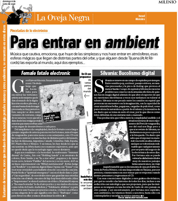 Good bye said the rain reseña en Textura "The geographical dimension alone is noteworthy, with sonic postcards sent from artists rooted in Argentina, Canada, Colombia, Chile, Germany, Puerto Rico, Spain, USA, and Mexico. Stylistically, the collection impresses too with much of it emphasizing dreamy electro-pop and solid club styles." Febrero 2008 ![]() Nuevo lanzamiento!! "Good bye said the rain" Es una colección de postales sonoras, diferentes estilos y vertientes (dream pop,electro, click-hop, techno ,minimalismo); distintas formas de exploración que cautivan por ser creadas por mujeres de países como Alemania, Argentina, Canadá, Colombia, Chile, España, Estados Unidos, Puerto Rico y México. Presentado en un bonito y delicioso digipack con ilustraciones cute de Isol. Disponible ya!! México Mix Up Sanborns Noisekontrol USA y otros países Darla Records New release!! "Good bye said the rain" It's a collection of sonic postcards, various styles & options (dream pop, electro, click-hop, techno, minimalism) different forms of exploration that captivate because they are created by women from countries such Argentina, Canada, Colombia, Chile, Germany, Puerto Rico, Spain, USA & Mexico. Presented in a beatiful and delicious digipack with cute illustrations made by Isol. Available now... USA & Worldwide Darla Records Mexico Mix Up Sanborns Noisekontrol 01. Carrie -Summer dream 02. Iris -Holding hands 03. Kate Simko -In a star orbit (remix of Rebecca Gates) 04. Lucrecia -Patillas 05. AGF -REfail instrumental 06. Robin Judge -Roulette 07. Ilana Ospina -Tenue 08. Purdy Rocks -Spiritual emergency 09. Quio - Gazon Gasolina 10. Alisu -Impresiones 11. Mariena Monjeau -Escenas Borradas 12. Audiofem -Telekinetic 13. Arturo en el barco -Burbujas |