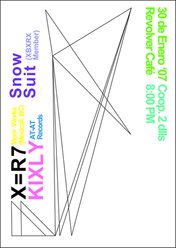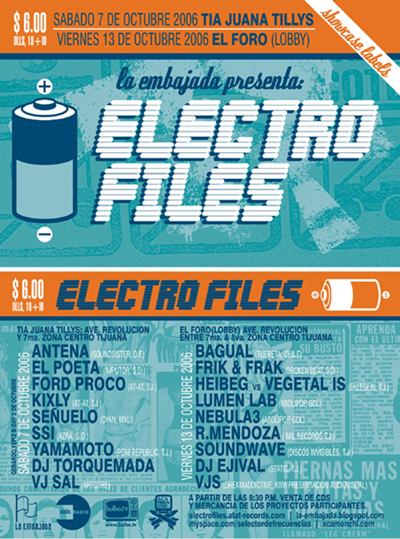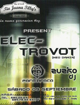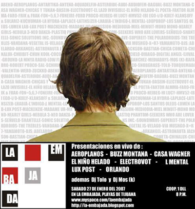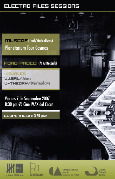 ![]() Viernes 7 de Septiembre, 2007 live! Murcof (leaf/static discos) Ford Proco (at at records) vjs sal (artcore) v-theory (dream addictive) 8:30pm @Cine Imax del CECUT Tijuana, Mex. coop. 60 pesos |
